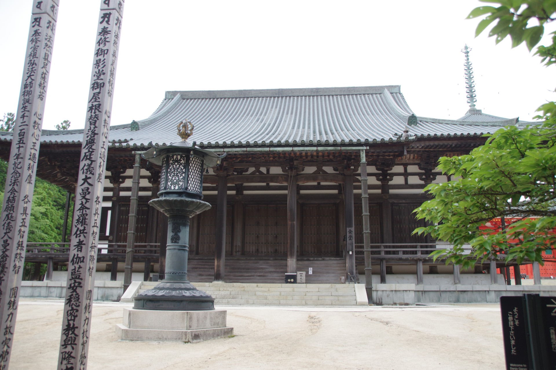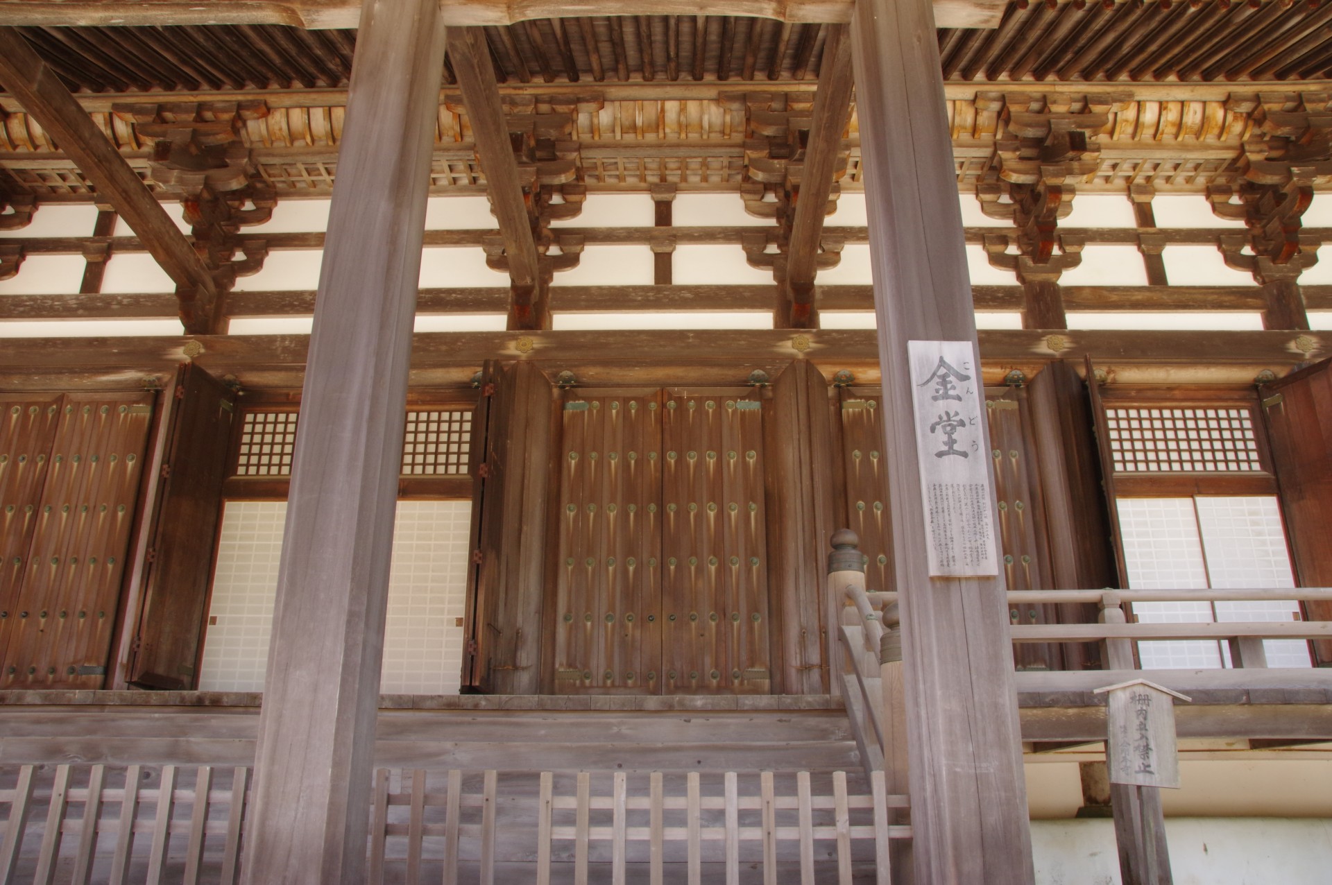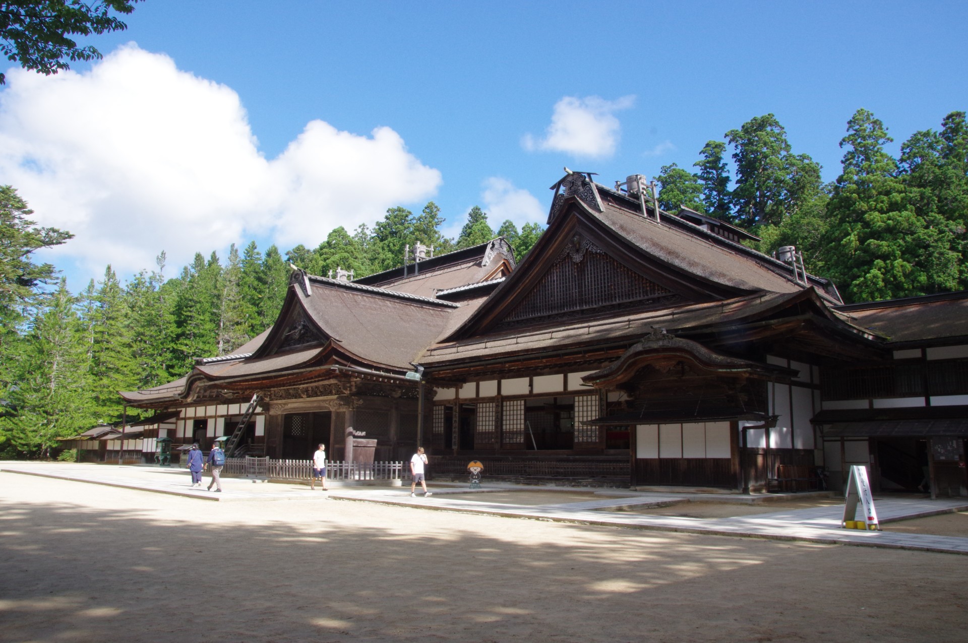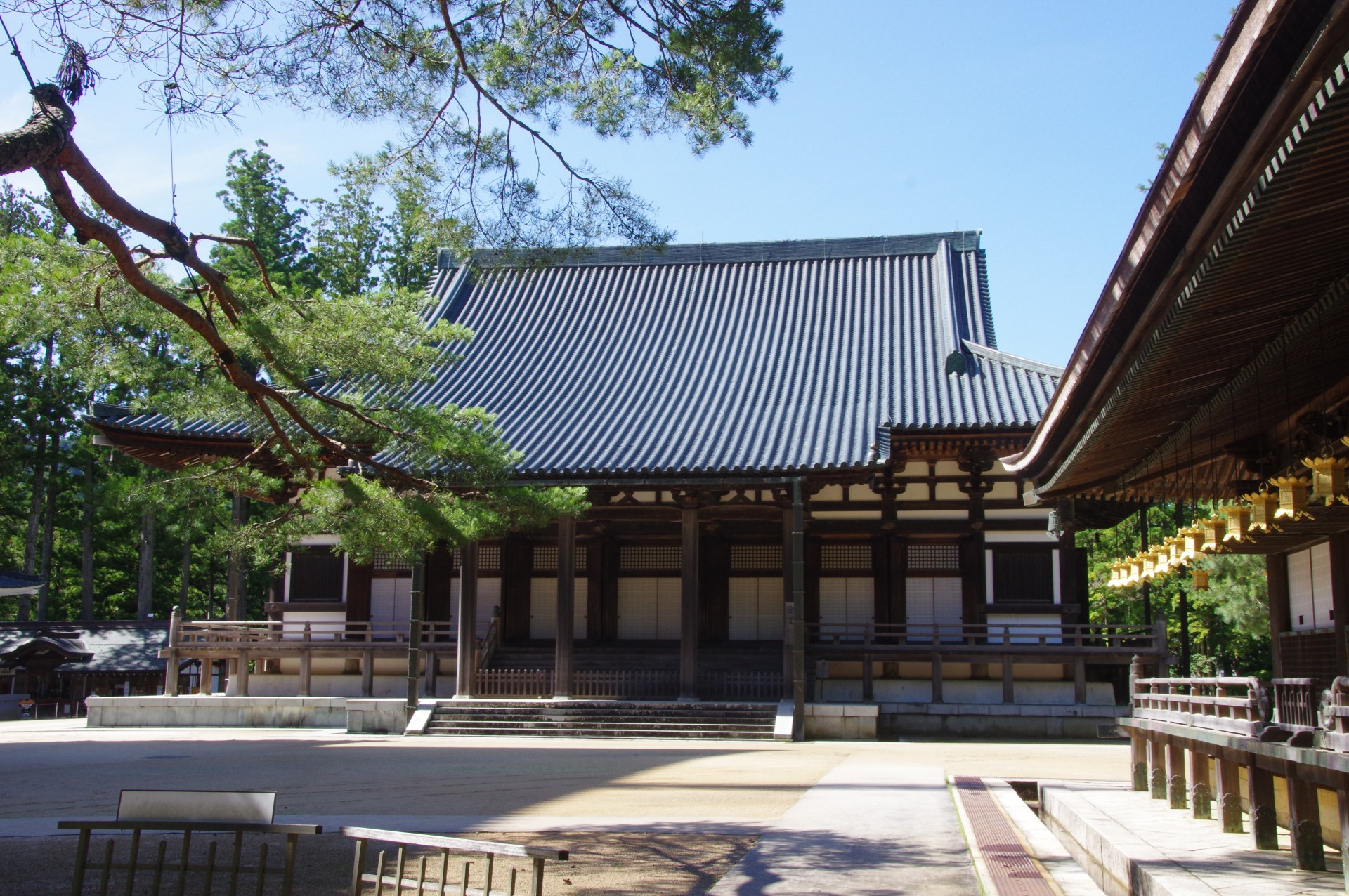 When Koyasan was founded. it was called the lecture hall. and since the mid-Heian period it has played an important role as the main hall of the temple. The current building is the seventh reconstruction. completed in 1932 (Showa 7). It has a gabled roof and the principal image is the Yakushi Nyorai Buddha by Takamura Koun. The murals inside are by painter Kimura Buzan. On both sides of the inner sanctuary. there are copies of the so-called "Blood Mandala." which was painted by Taira no Kiyomori with the blood of his own forehead.