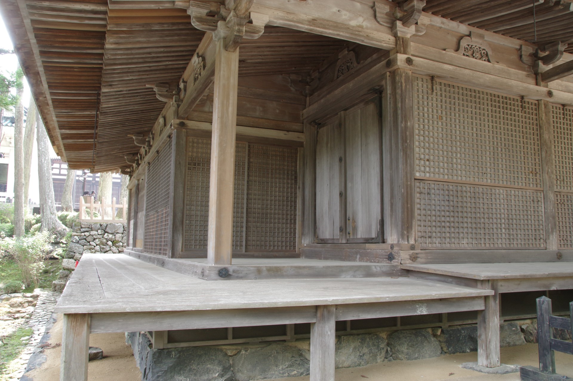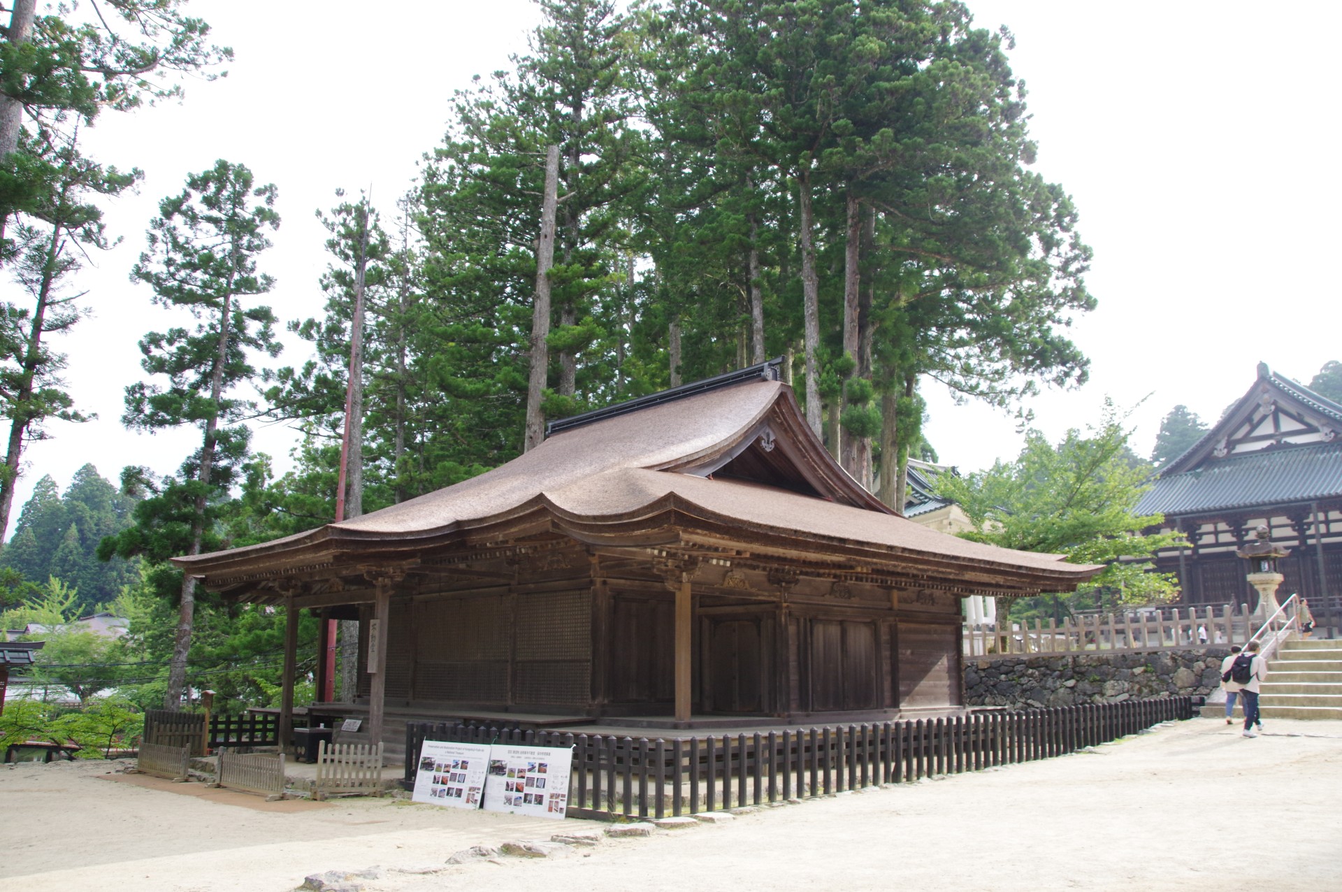 This hall. built in the style of a hogake style building in front of the legendary Sanko Pine. was originally the Daishi's personal Buddha hall. It was later named Miei-do Hall after the Daishi's portrait painted by Shinnyo Shinno was enshrined there. In the outer sanctuary of the hall. portraits of the Ten Great Disciples are hung as if to protect the Daishi's portrait. The current building was rebuilt in 1847 (4th year of the Koka Era) after it burned down in 1843 (14th year of the Tenpo Era).