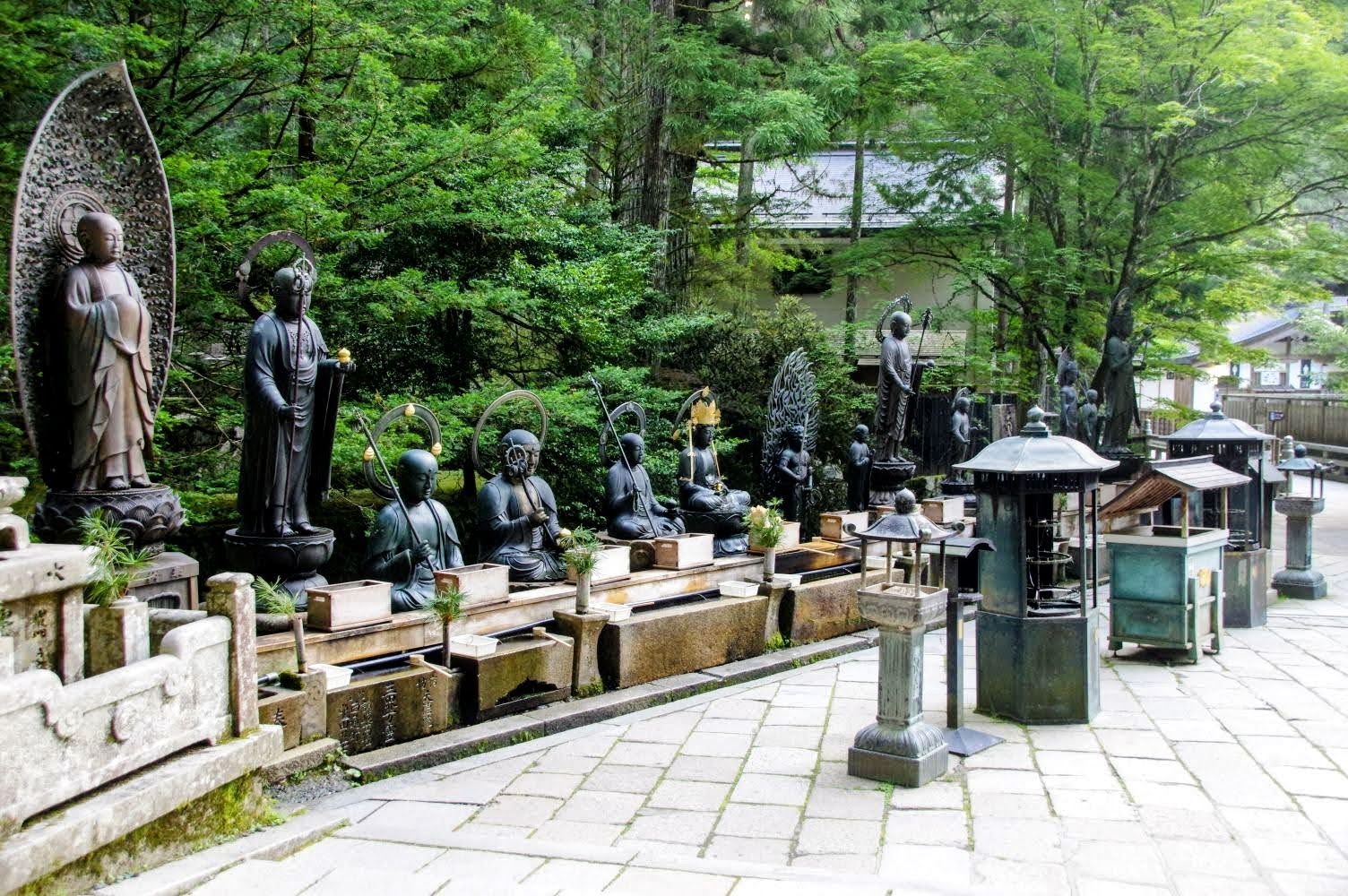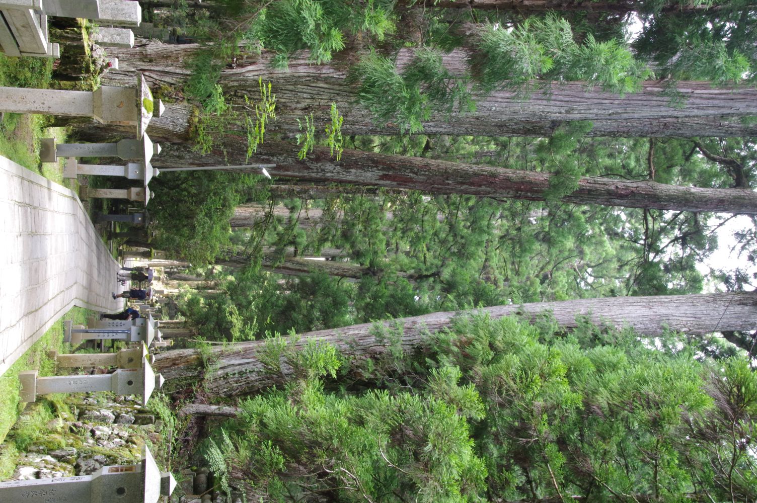 On both sides of the approximately 2 km approach leading from Ichinohashi. the entrance to the main approach. to Kobo Daishi's mausoleum. towering old cedars that are hundreds of years old. Under these old cedars stand more than hundreds of thousands of memorial towers for people from all eras who wish to be as close to the Daishi as possible. proving that Koyasan is the most sacred place in Japan.